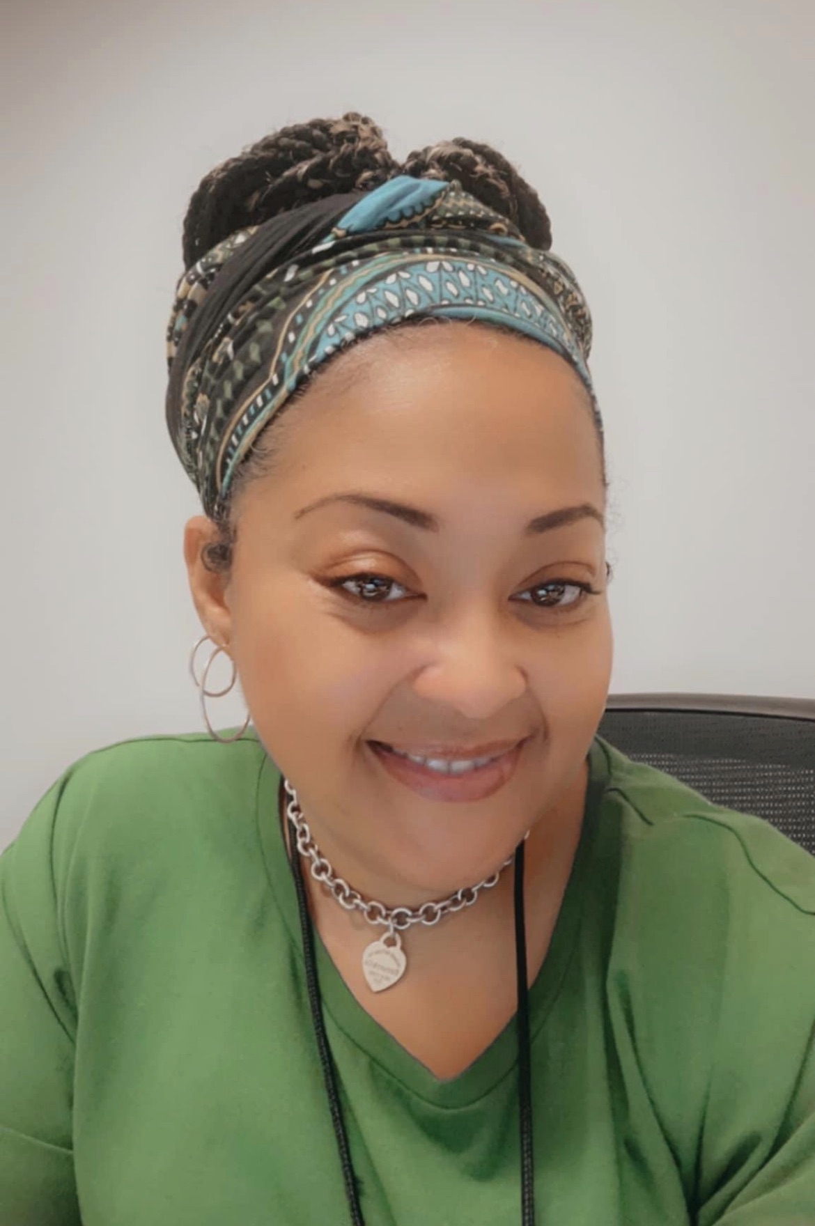 Mariam Spalding is a Black woman who wears a long sleeved green shirt. She wears her hair up in locs with a black and turquoise patterned head scarf. She has a silver choker necklace with a heart.